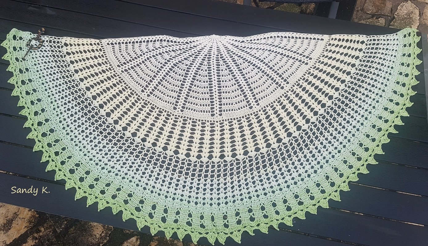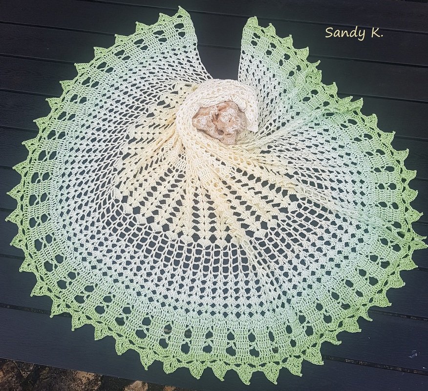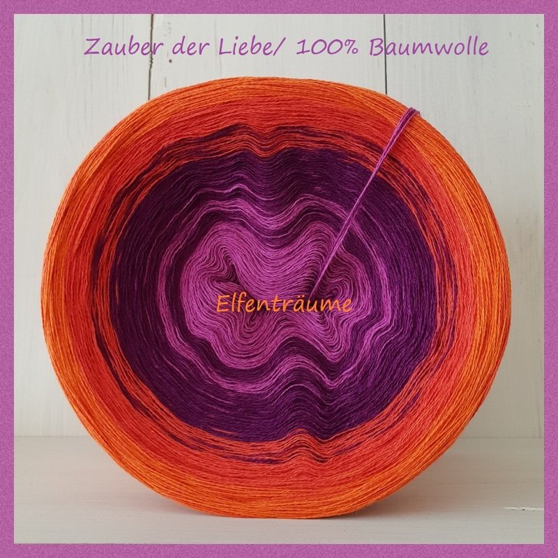 Verarbeitet habe ich eigenes Garn, "Elfenträume-Fabelhafte-Farbveraufsgarne", aus 100% gekämmter Baumwolle - „Zauber der Liebe“! Der Verlauf meines Tuches ist im „Tuchverlauf“ gewickelt.