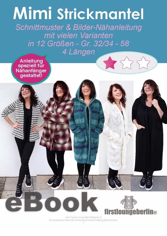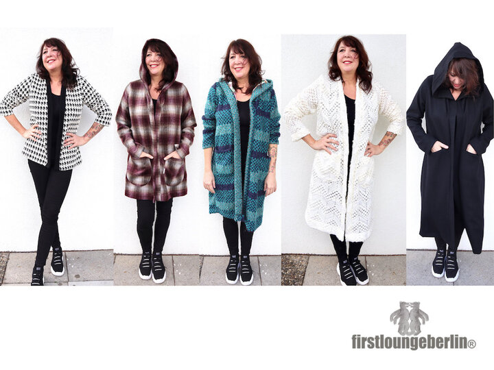 ♥♥Diesen wunderbaren Kuschelmantel gibt es in 4 Längen, von kurz bis sehr lang und in 3 Taschenvarianten. Eine runde und eckige Tasche kann aufgenäht werden oder aber auch in den Mantel eingenäht werden. Der Mantel kann mit oder ohne Kapuze genäht werden. Der Kapuzenschnitt beinhaltet 3 Größen, aus denen man frei wählen kann, und sie kann auch gefüttert werden. Der Mantel kann sowohl aus Strick, Sweat aber auch aus Wolle, Cord oder z.B. Denim genäht werden - also aus dehnbaren und nicht dehnbaren Geweben. Das macht diesen ungefütterten Mantel so vielseitig, dass Kreative sich hier richtig austoben können. Durch die Schritt für Schritt detaillierte Foto-Anleitung und der sehr ausführlichen Beschreibung ist das ein wunderbares Anfängerprojekt. Tipps für Verschlüsse und Nähvarianten sind hier auch dabei. Viele Nähvarianten werden gezeigt, und mit einer einfachen Haushaltsmaschine genäht kann hier nichts mehr schiefgehen. ♥♥