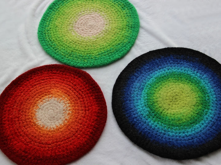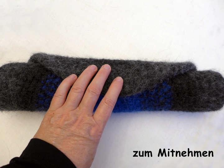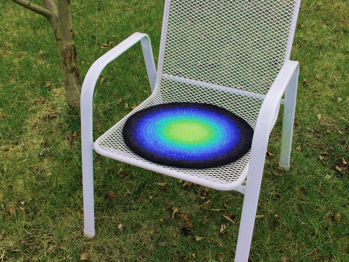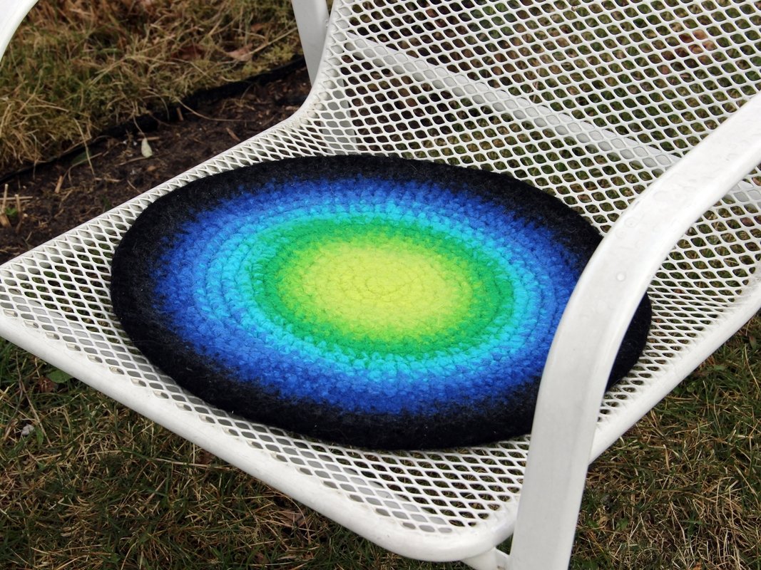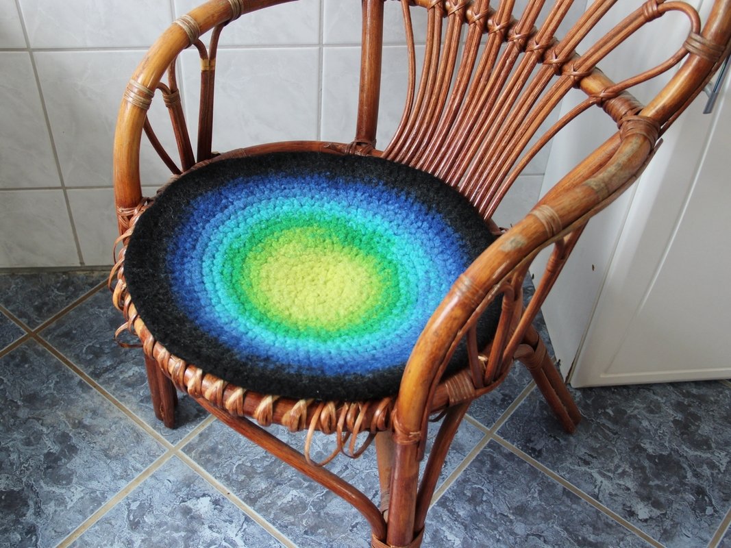 Jeder kennt das: Man sitzt irgendwo auf kalten Steinen oder Plastikstühlen und wünscht sich nichts mehr als ein Kissen unter dem Popo. Dieses Kissen hier wäre mit seinem 1 cm dicken Filz ein idealer Schutz vor der Kälte. Schnell eingerollt und mitgenommen, werden wir es nicht mehr missen wollen. Ein ideales Kissen, was man schnell und unkompliziert aus Filzwolle und Filzwollresten selbst anfertigen kann. Wir häkeln es, die Waschmaschine übernimmt das Filzen.