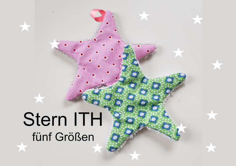 Stickdatei Stern in the Hoop - fünf Größen in zwei Stickvarianten. Einmal mit integrierter Wendeöffnung, einmal mit Wendemöglichkeit im Rückteil.