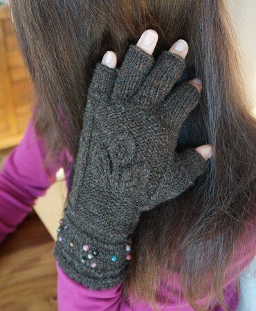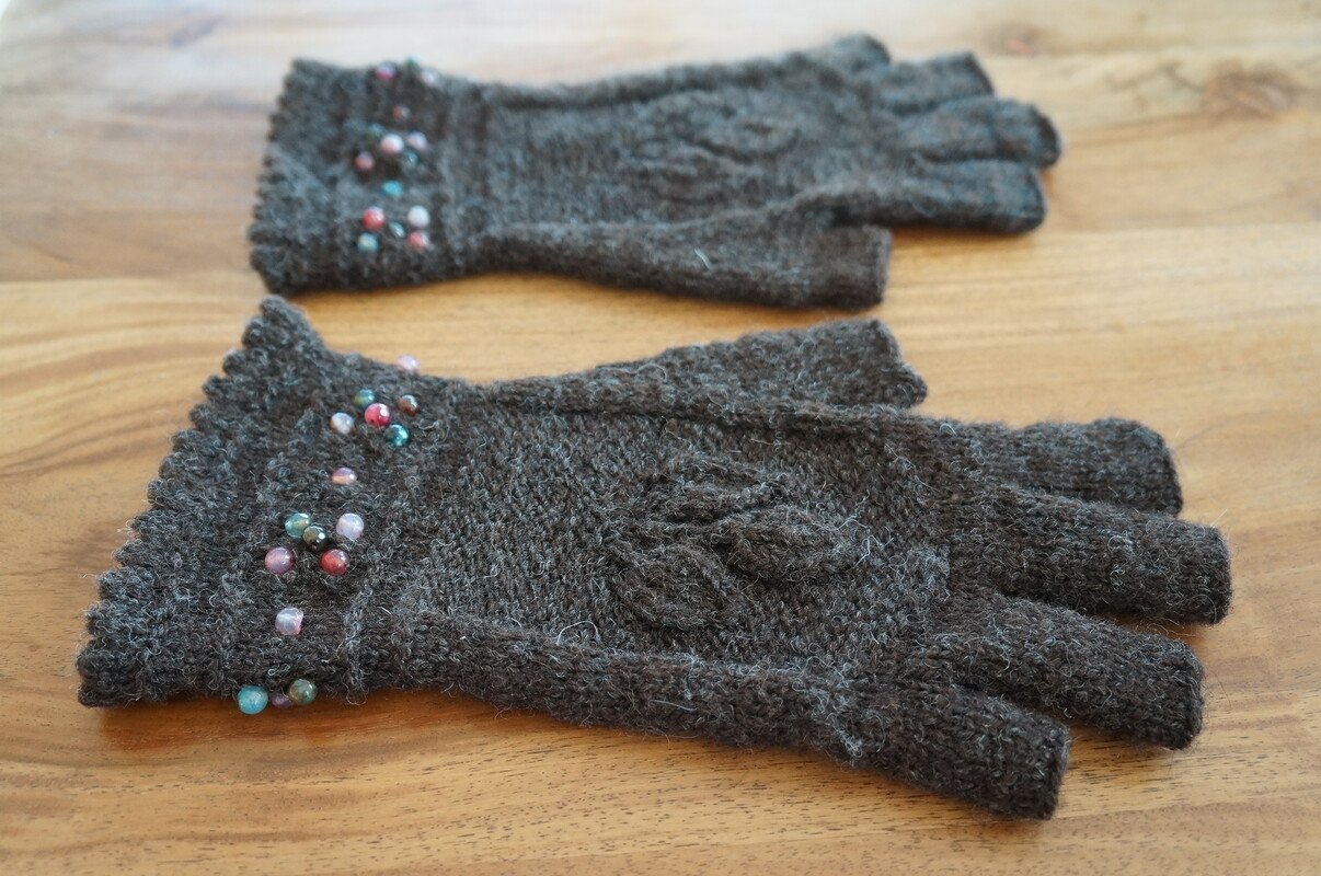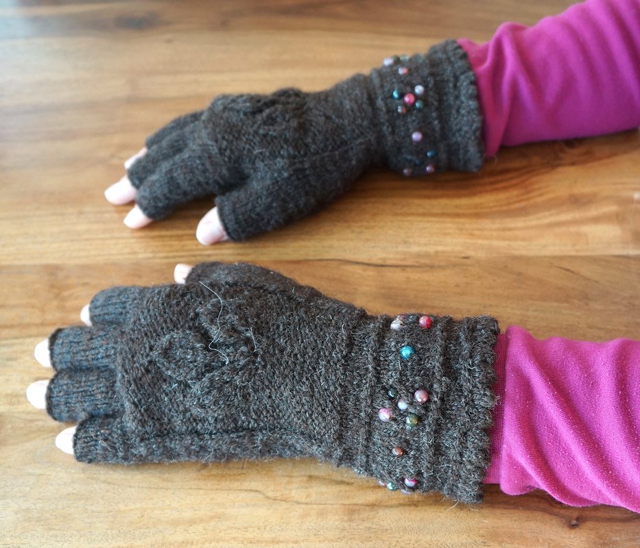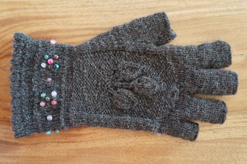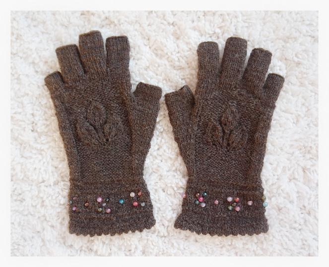 Die Besonderheit der Handschuhe liegt in dem Blattmuster auf dem Handrücken und den Lochmuster am Armbund, in welches ich Perlen eingenäht habe.