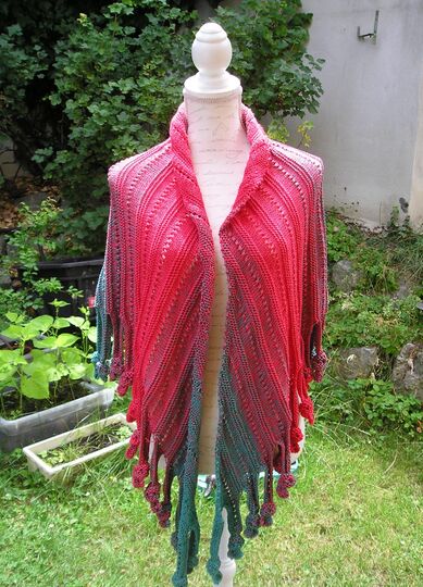 Das Tuch wurde aus zwei 5-fädigen LoLa-Farbverlaufsbobbeln (50 % Baumwolle, 50 % Acryl) je 200 g von der Garnmanufaktur gestrickt. Man beginnt unten in der Mitte mit den ersten beiden Zipfeln. Darüber werden Streifen mit Lochmustern aufgetürmt und mit Zipfeln an den Enden, bis die Höhe des Dreieckstuches erreicht ist. Danach müssen rechts und links die Flügel angestrickt werden. Damit das mit der Farbverteilung einigermaßen gleichmäßig ausgeht, strickt man immer abwechselnd zwei Streifen auf der rechten und zwei Streifen auf der linken Seite. Das Ganze verständlich zu beschreiben war ziemlich schwierig. Dafür war das Stricken nicht so schwierig. Trotzdem ist die Anleitung für Anfänger nicht unbedingt geeignet.