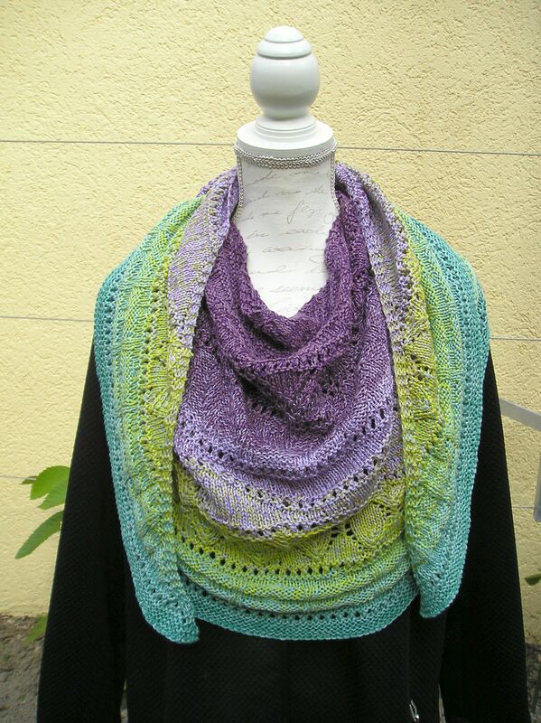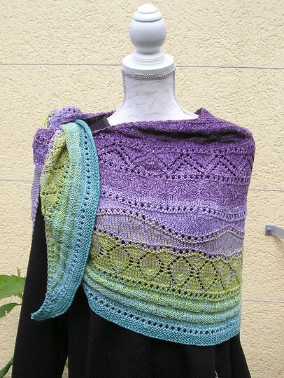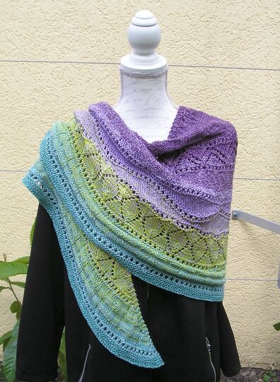 Das Tuch wird aus einem 250 g LoLa-Farbverlaufsbobbel (50 % Baumwolle, 50 % Acryl) 5-fädig von der Garnmanufaktur gestrickt. Man beginnt oben in der Tuchmitte und strickt zunächst die Randmaschen. Damit das Tuch in die Breite wachsen kann werden nach den Randmaschen am Reihenanfang und vor den Randmaschen am Reihenende Maschen zugenommen. Um die halbrunde Form zu erhalten, müssen auch im Musterteil des Tuches immer wieder verteilt Maschen zugenommen werden. Der Musterteil besteht aus einem Mustermix aus Lochmustern, Mustern aus rechten und linken Maschen und solchen mit verkürzten Reihen. Das Tuch ist eher was für fortgeschrittene Strickerinnen.