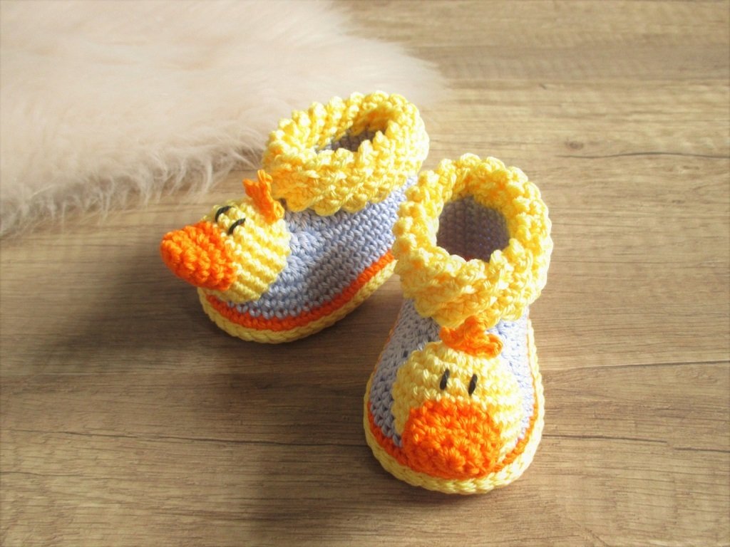 Die zauberhaften Babyschühchen im Entendesign passen prima zu Emely Ente (die Anleitung dazu findest Du hier: https://www.crazypatterns.net/de/items/6766/haekelanleitung-emely-ente) - zusammen ein tolles Duo zur Geburt!