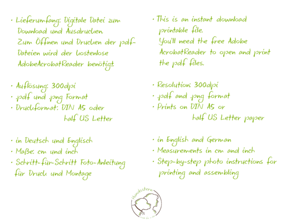 Anleitungen und Druckdateien sind nur für den privaten Gebrauch bestimmt. Veröffentlichung, Weitergabe, Weiterverkauf (auch von nach unseren Anleitungen gefertigten Produkten) ist ausdrücklich nicht gestattet. Für eventuelle Fehler in der Anleitung wird keine Haftung übernommen.
