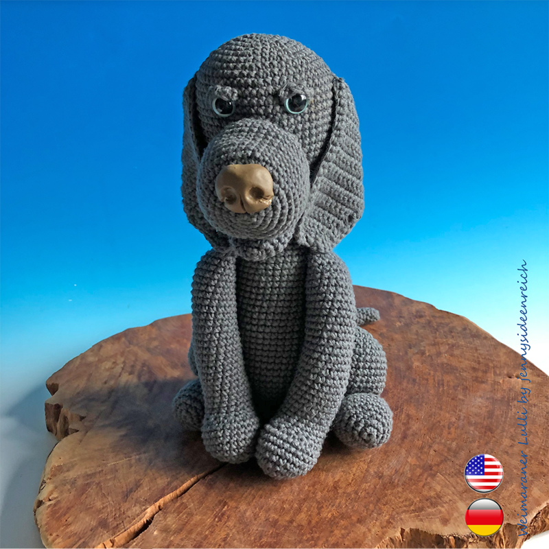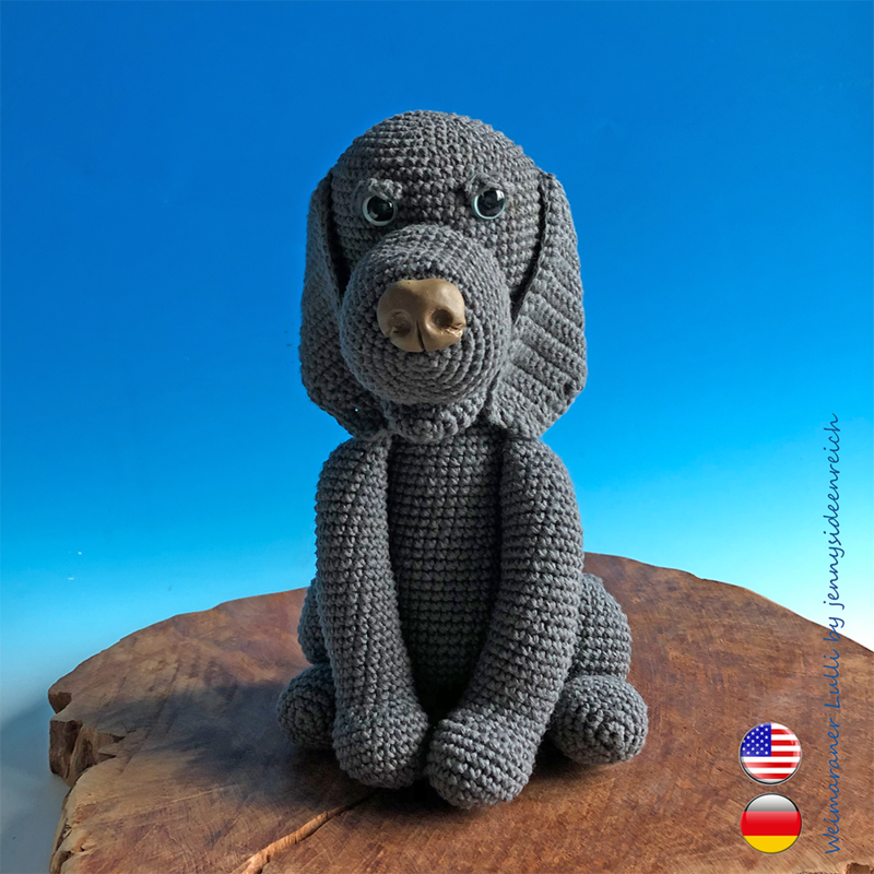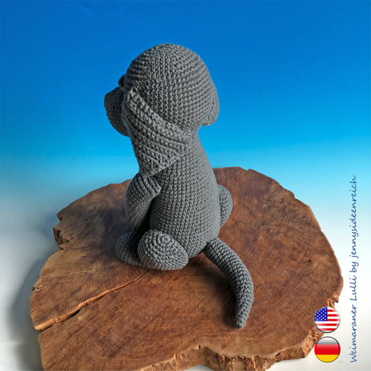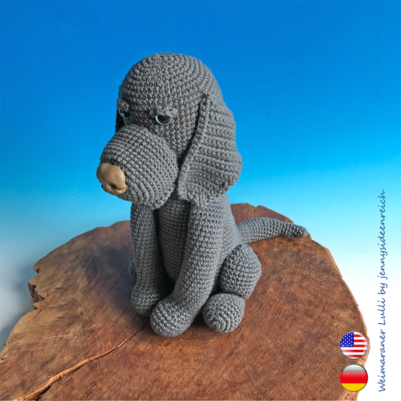 Ihr könnt hier die komplett ausformulierte Häkelanleitung zum Weimaraner Lulli erwerben Sie ist 12 Seiten lang und besteht aus Texten und Bildern zu allen Einzelteilen.