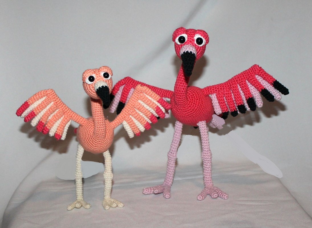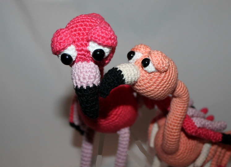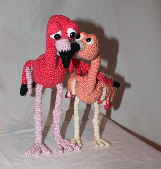 Für den großen Flamingo habe ich Schachenmayr Catania und die 2,5 er Nadel genutzt, für den kleinen Schachenmayr Baby Smiles und die 2er Nadel. Gehäkelt werden Sie genau gleich.