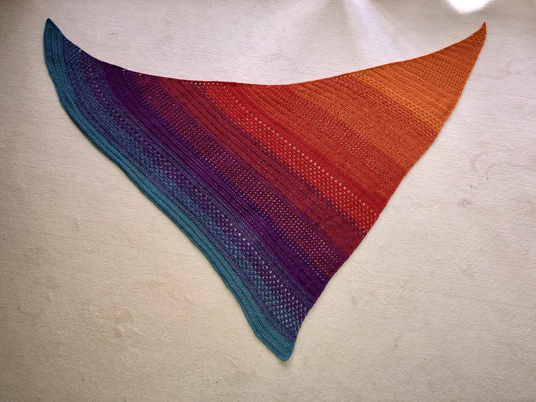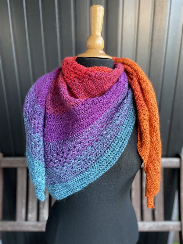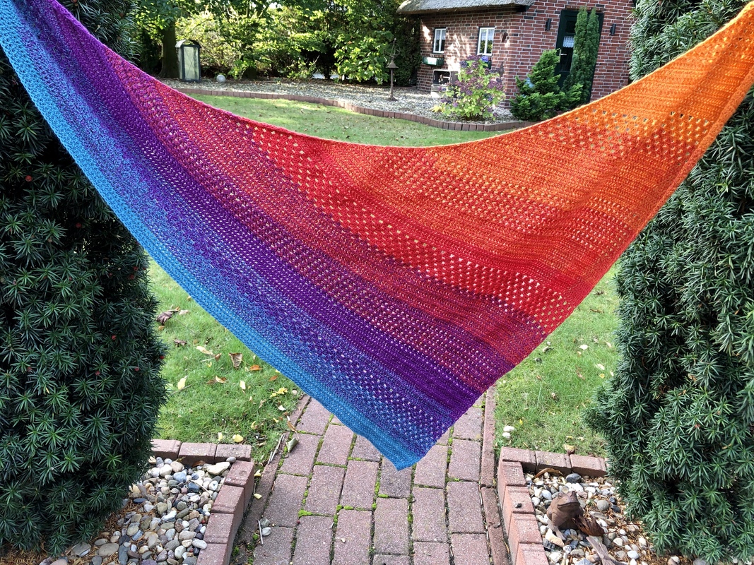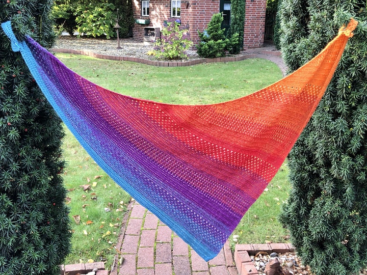 Mein Beispieltuch hat eine Spannweite von 1,42m und eine Tiefe von 0,77m, gehäkelt mit einem 3-fädigen Bobbel und NS 4.