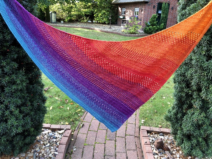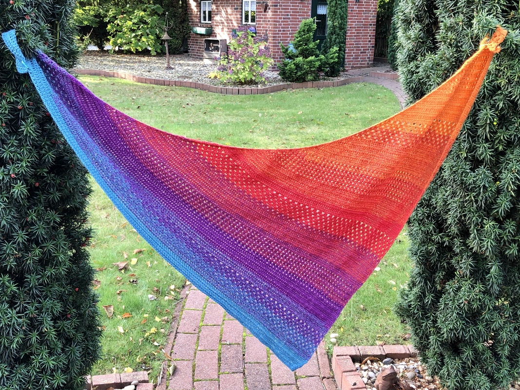 Um das Tuch nachzuarbeiten, empfehle ich einen Farbverlaufsbobbel (3- oder 4-fädig) mit mindestens 1000m Lauflänge. Dazu eine passende Häkelnadel, sowie eine stumpfe Stopfnadel, um die Fäden zu vernähen.