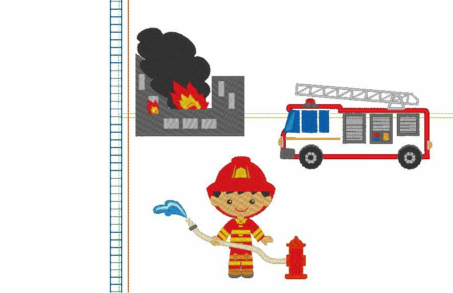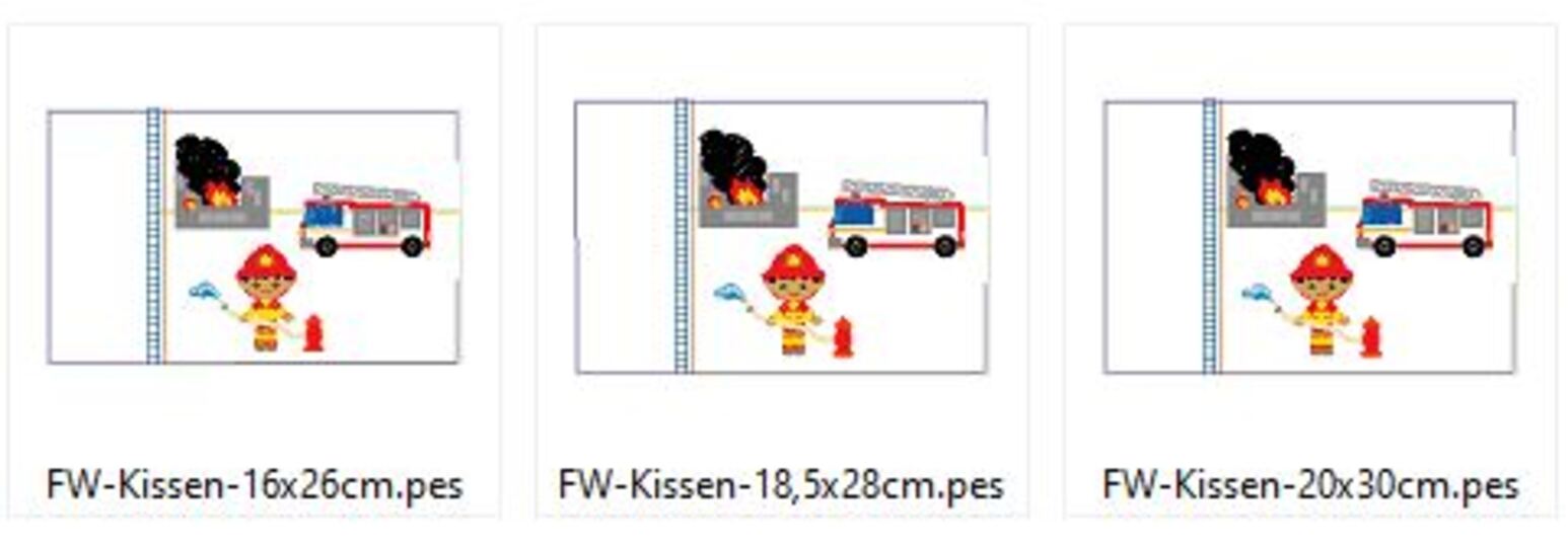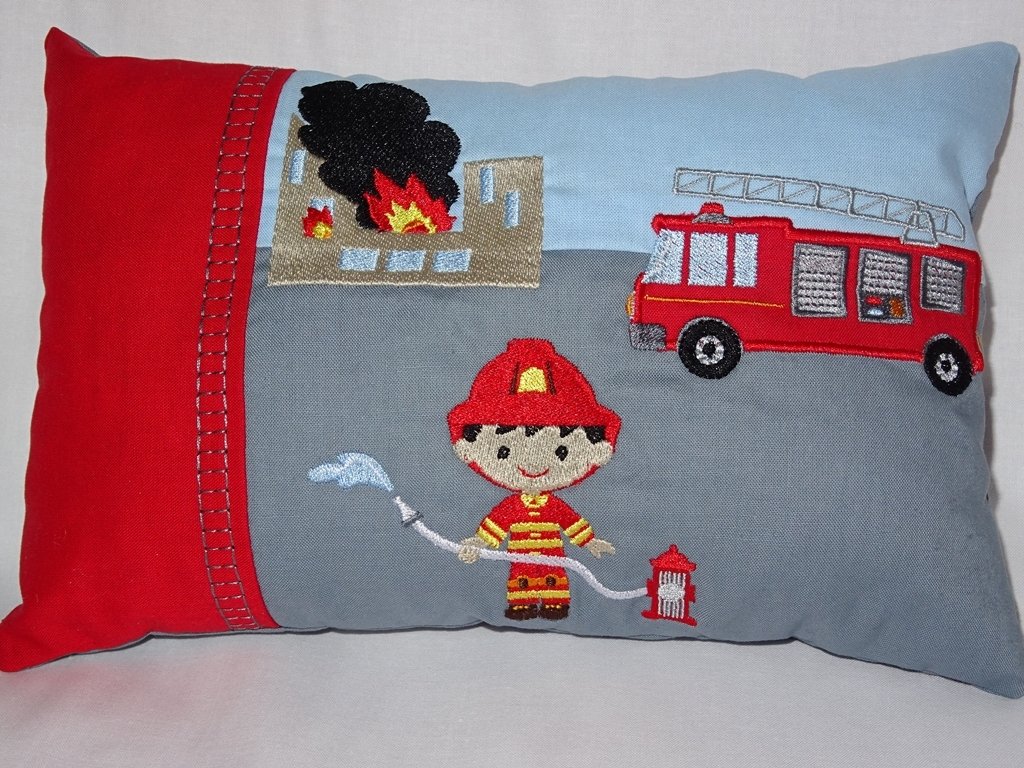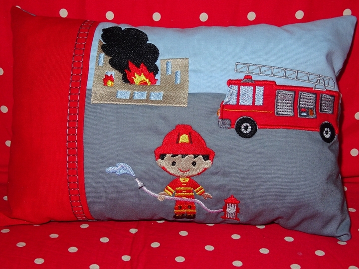 Stickdatei für ein allerliebstes Feuerwehr Kissen mit Feuerwehrmann, Feuerwehr und brennentem Haus ITH