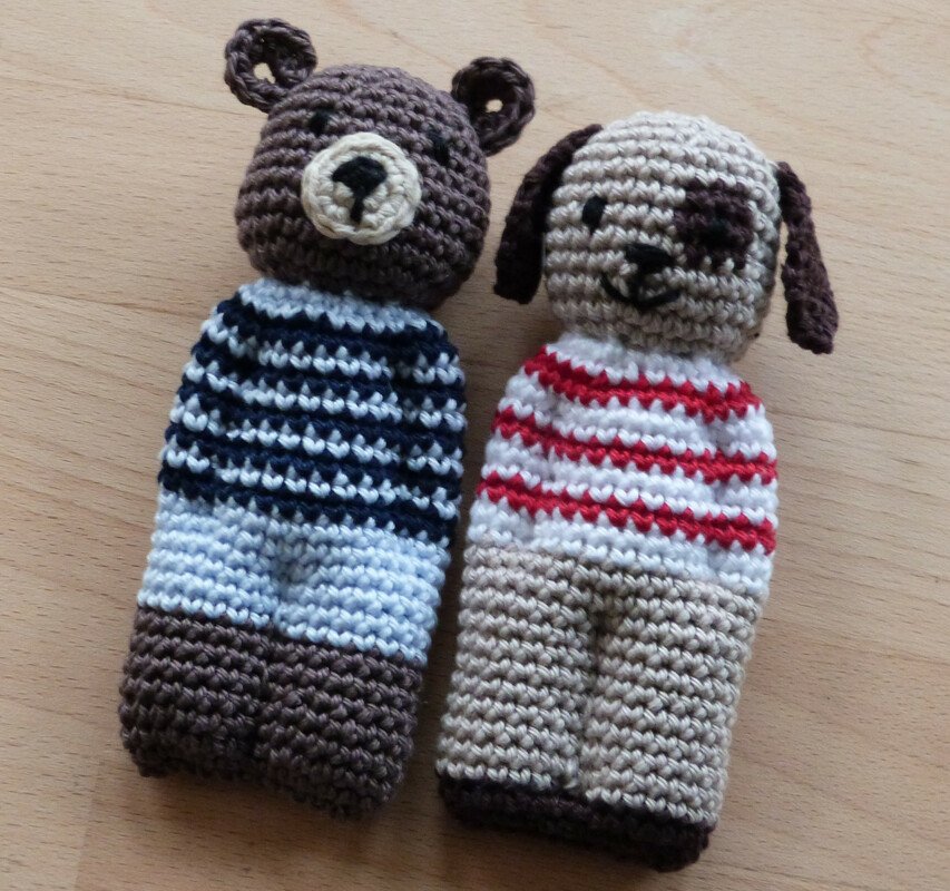 Die Tier-Püppchen können mit jedem beliebigen Garn und passender Nadel gehäkelt werden. Gut geeignet sind Reste gleicher Garnstärke. Als zusätzliches Material brauchst du Füllwatte, eine Stopfnadel und evtl. eine kleine Rasseldose.