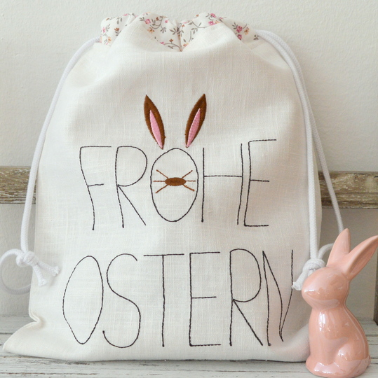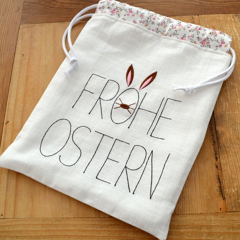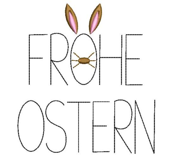 Stickdatei Schriftzug "Frohe Ostern". Damit könnt ihr ganz schnell eure Osterbeutel, Taschen, Kissen oder Deko für Ostern aufpeppen, schnell gestickt und doch Wirkungsvoll.