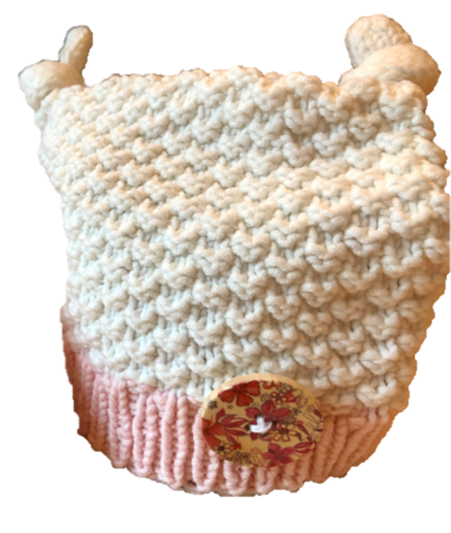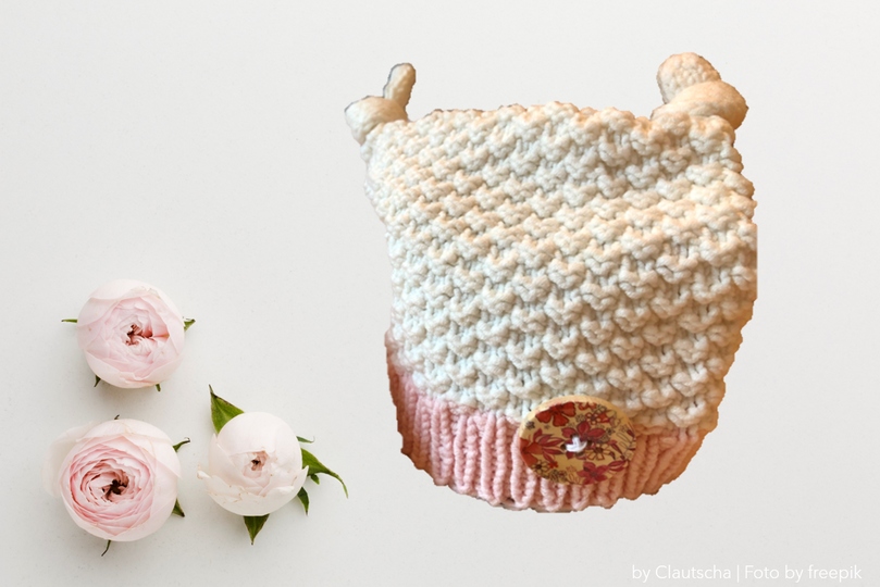 Diese Strickanleitung für die süße Baby-Mütze mit zwei Knötchen ist sehr leicht zu stricken und ein echter Hingucker.