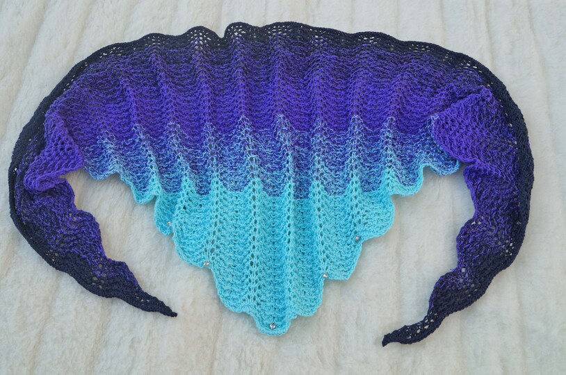 Das ganze Tuch zieren Lochmusterwellen und an allen Rändern ergeben sich tolle Wellen. Die Enden laufen spitz zu so dass es sich super in vielen Variationen tragen läßt