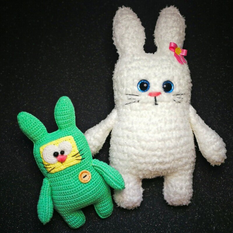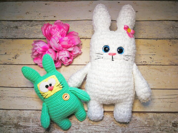 • Wolle, ich habe die Catania von Schachenmayr (50g – 125m) für das kleine Häschen verwendet, das Garn besteht aus Baumwolle und ist somit bestens für Kinder- und Babyspielzeug geeignet, die größere Figur wurde mit Lenja soft von Schachenmayr (25g – 85m) Catania als Beilaufgarn gearbeitet.