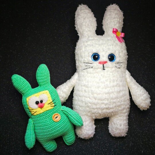 • Ich erkläre dir die Herstellung anhand der kleineren Figur (hellgrünes Häschen), du findest jedoch Anmerkungen zur großen, flauschigen Figur.