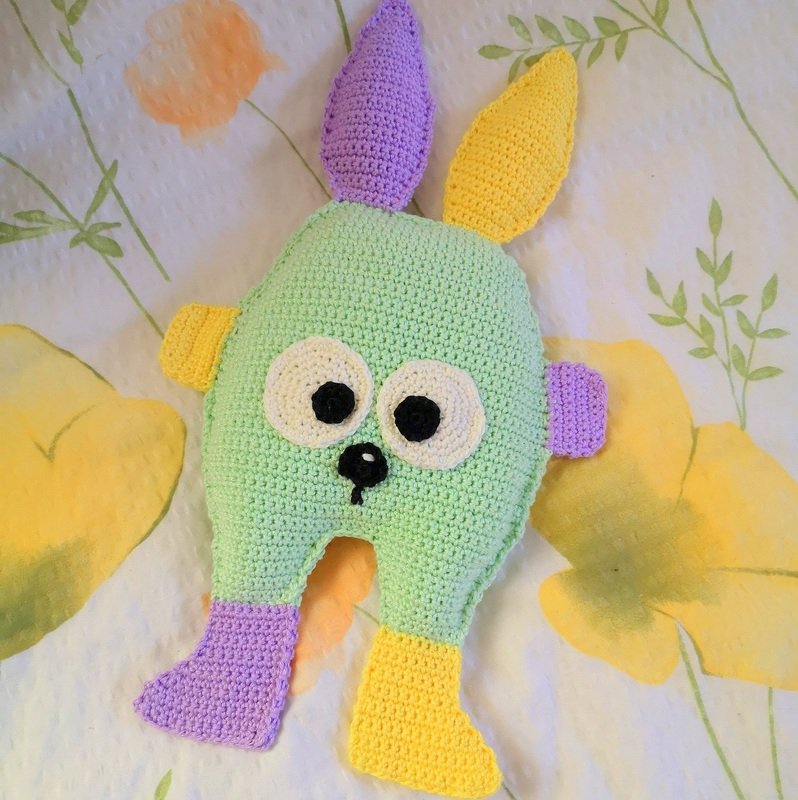 Der hier abgebildete Schmuse- und Spiel Hase ist ca.32 x 20 cm groß, besteht aus zwei gleichen Teilen und wird ausschließlich mit festen Maschen (fm) in Hin- und Rückreihen gehäkelt.