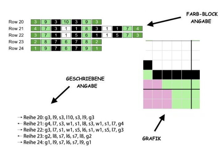 -farbige Zahlen-Blöcke für jede Zeile für C2C-Technik