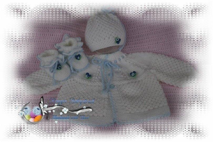 Strickanleitung für ein wunderschönes Set, 3-teilig für Babys & Reborns, Gr. 50 - 56 Das Set ist aus Babysoftwolle Nd. - Nr. 2,75 gestrickt. Die Anleitung ist sehr genau beschrieben und mit vielen Fotos. Du kannst mit dieser Schritt – für – Schritt – Anleitung dieses Set leicht nacharbeiten.