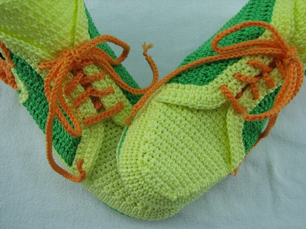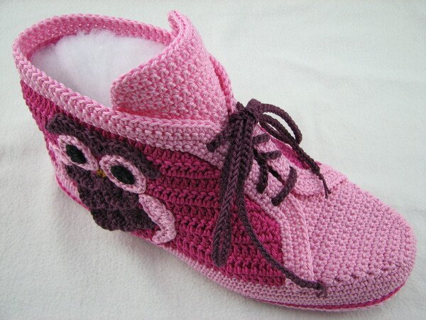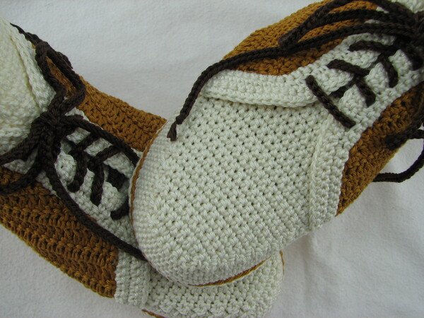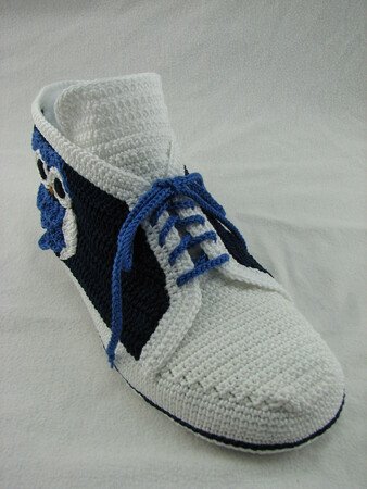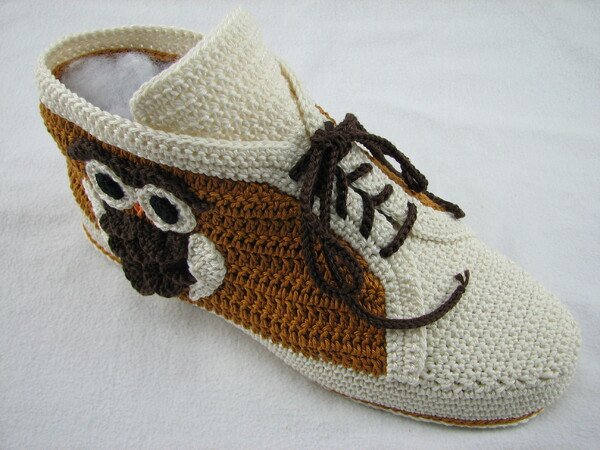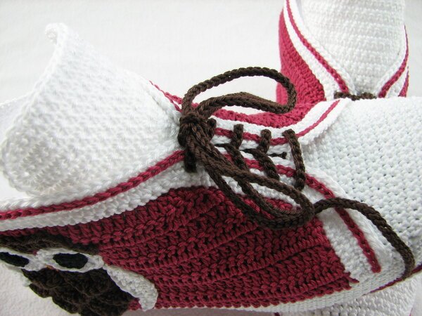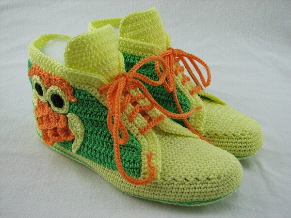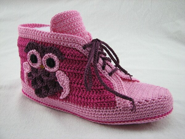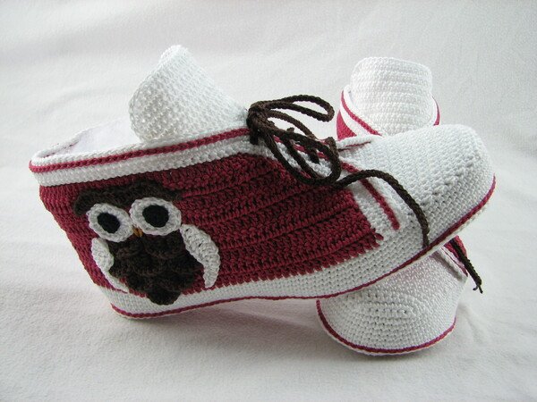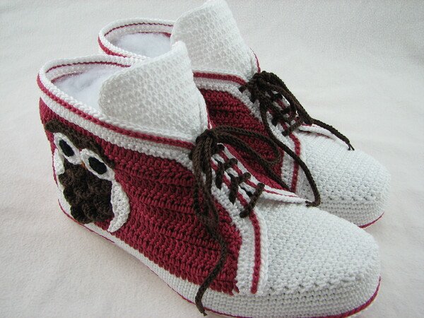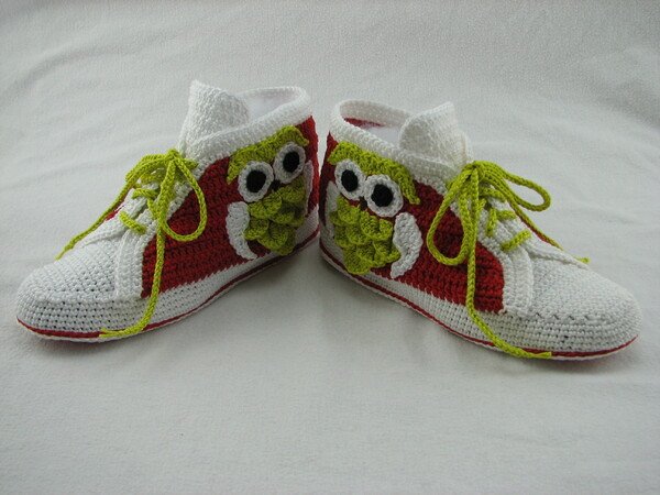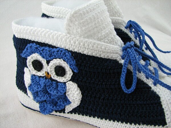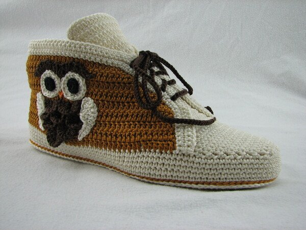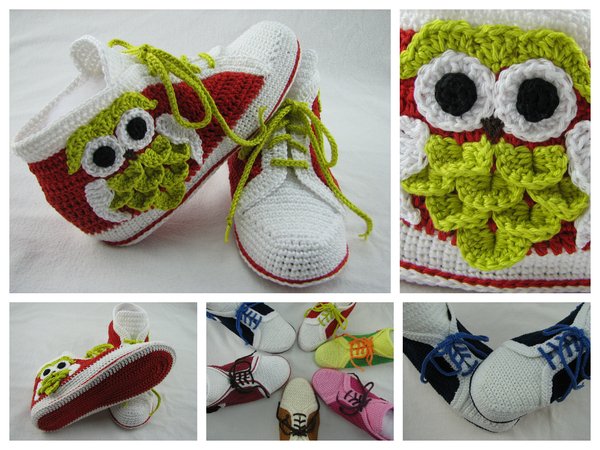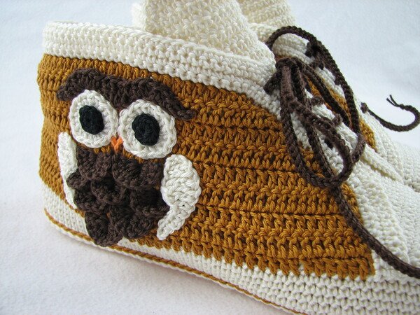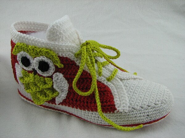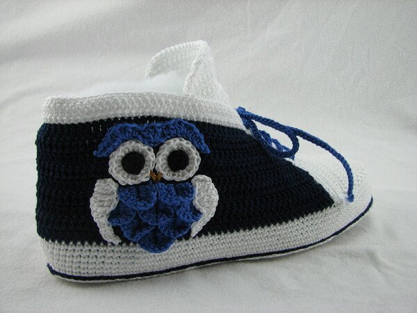 Häkelanleitung für Hausschuhe in Sneakeroptik. Der absolute Hingucker ist die Eule seitlich am Schuh. Durch die Verwendung des Baumwollgarns sind sie optimal für die Übergangsjahreszeiten geeignet. Die Schuhsohle ist ergonomisch geformt, so dass eine gute Passform gewährleistet ist.