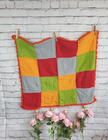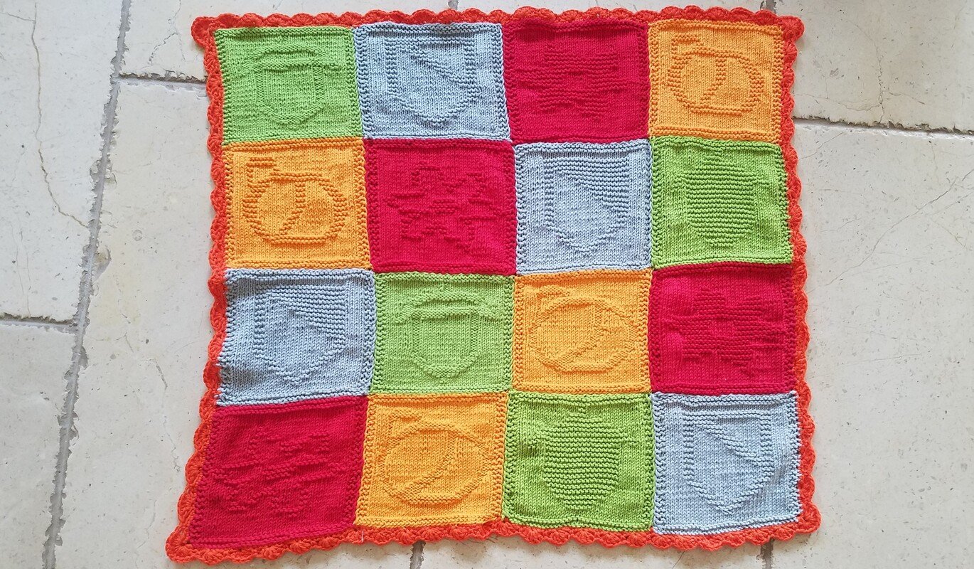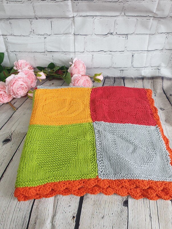 Dies ist eine Strickanleitung für eine Baby ecke gefertigt aus 16 quadraten und mit Festen Maschen und muschel muster umhäkelt. Die Decke ist ein einzigartiges Geschenk und bringt freude in jede Babystube mit den Farben und mustern.