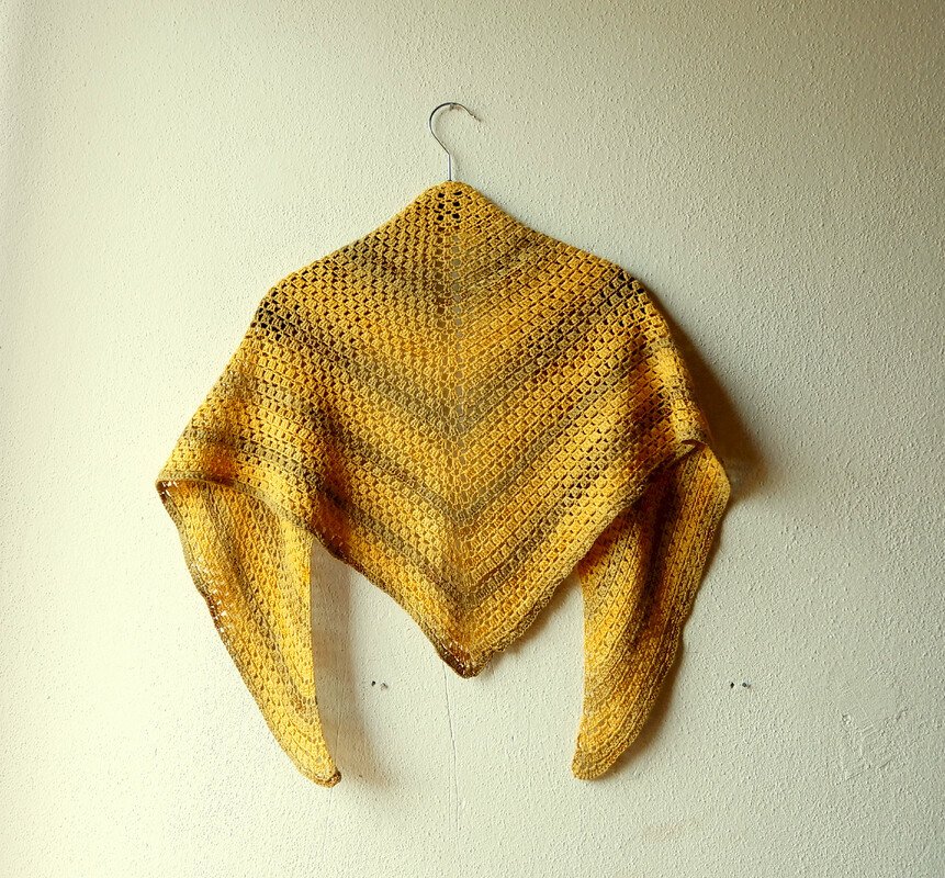 Bananas ist ein einfaches Dreieckstuch, das von oben nach unten gearbeitet wird. Für mein Tuch habe ich ein dünnes Baumwoll-Viskose-Garn verwendet, jedoch kann man wirklich jedes beliebige Garn verwenden.