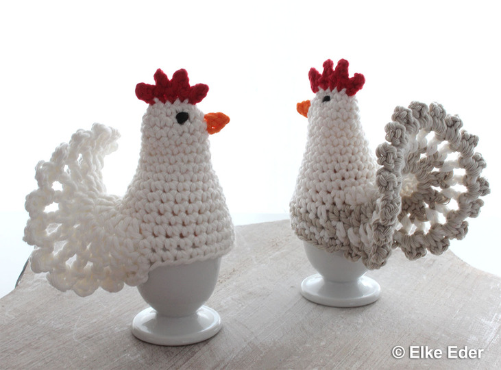 Wer erinnert sich nicht an diese niedlichen Eierwärmer-Hennen, wie sie meist schon bei Oma im Einsatz waren. Ich habe sie mit dickem Garn gearbeitet und etwas modifiziert und bin ganz verliebt in das süße Federvieh.