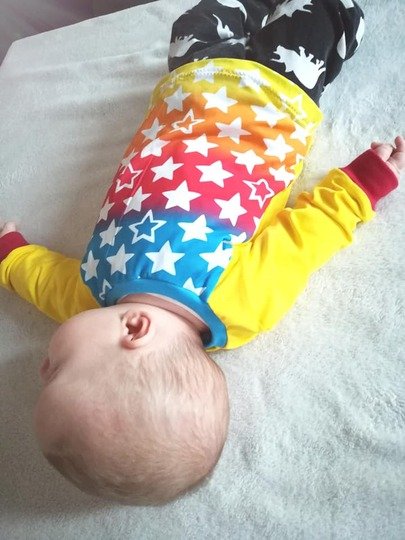 Nähbar von Gr. 50-92 (Hauptteile jeweils in Doppelgrößen, die Ärmel in Einzelgrößen) kannst du das Shirt idealerweise aus Jersey fertigen. Auch sehr gut dehnbarer Sommersweat ist denkbar.