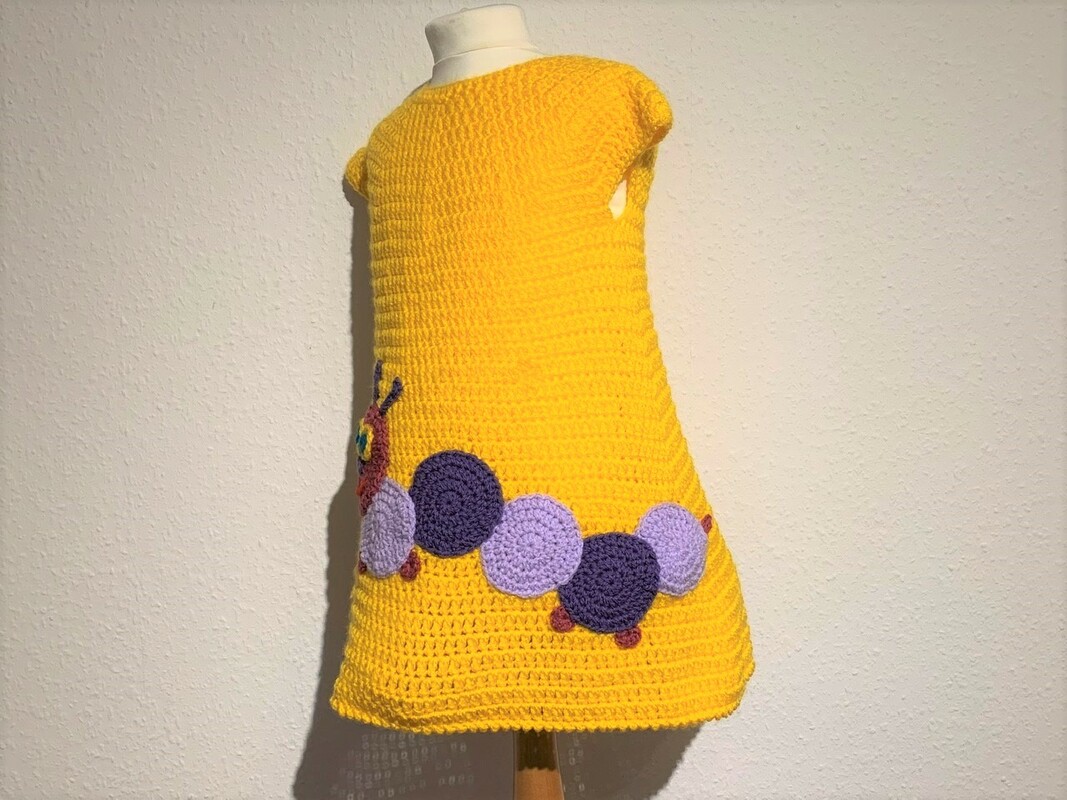 Das "Kleid mit Raupe" war die Idee und der Traum meiner jüngsten Tochter! So - und zwar genau so ;) - sollte es aussehen! Als es fertig war, strahlten die Äuglein mit dem herrlichen Gelb des Kleides nur so um die Wette!