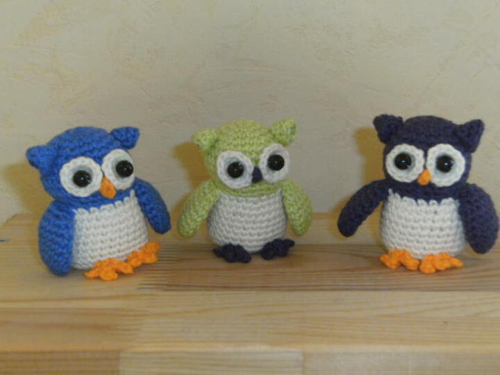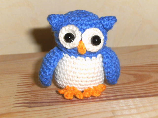 Mit dieser Anleitung könnt Ihr eine kleine Eule häkeln. Sie eignet sich hervorragend als Taschenbaumler, Glücksbringer oder Schlüsselanhänger. Sie wurde in bunter Mischung auch schon zu einem Mobile verarbeitet und hat in individuellen Fabrkombinatioenen viele Liebhaber gefunden.