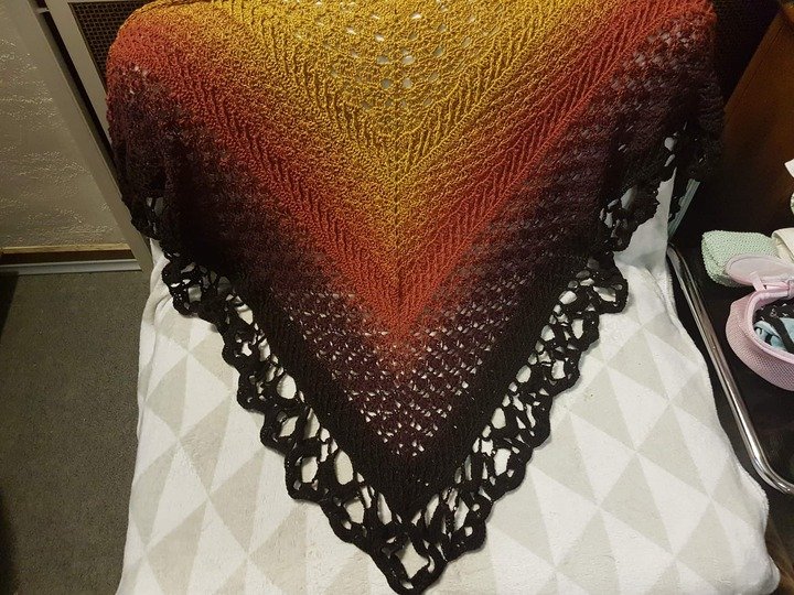 Für dieses Dreieckstuch habe ich 1200lm in 4 fädiger Stärke benötigt. Gehäkelt wurde dieses mit Nadelstärke 3,5.