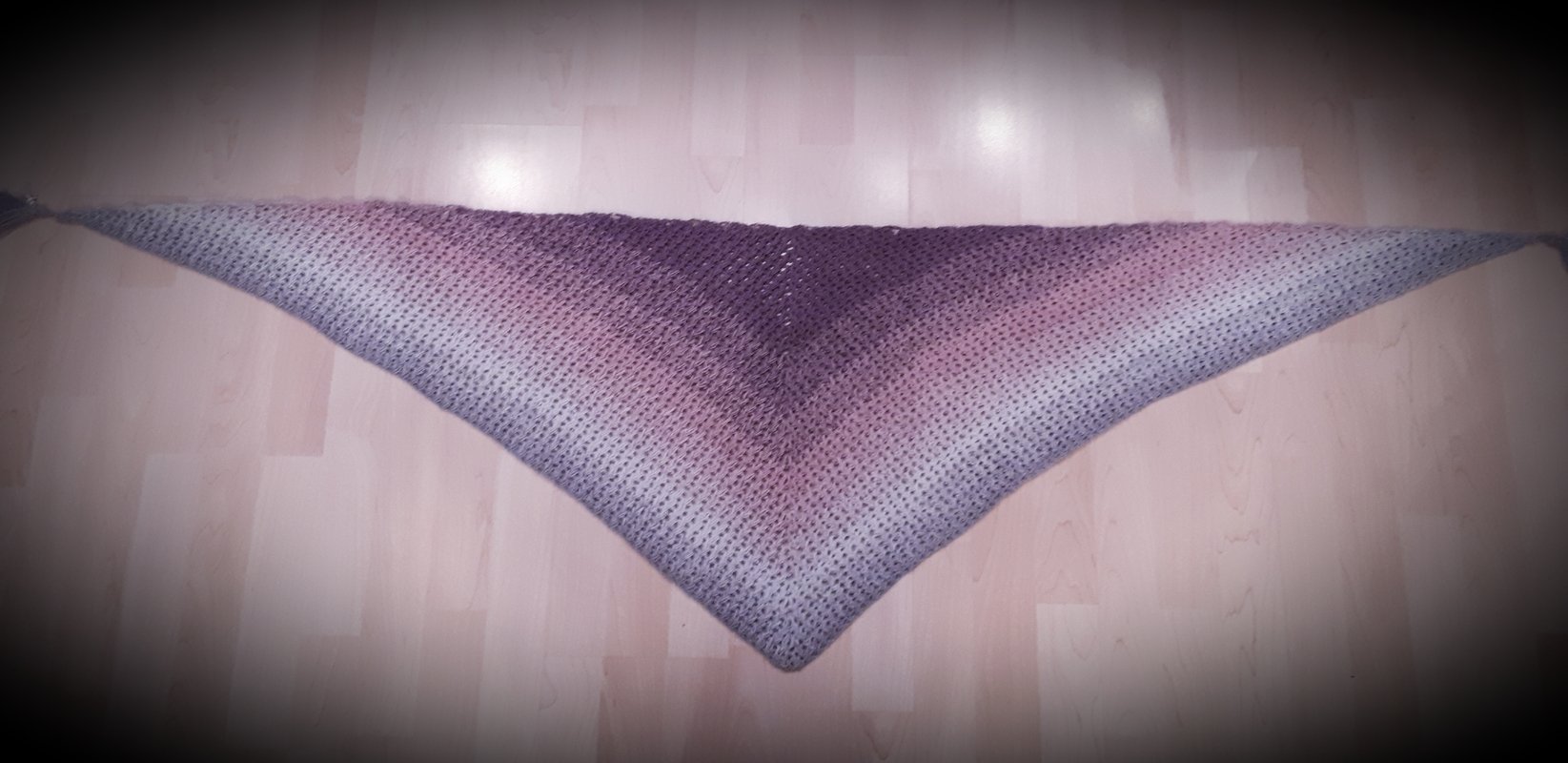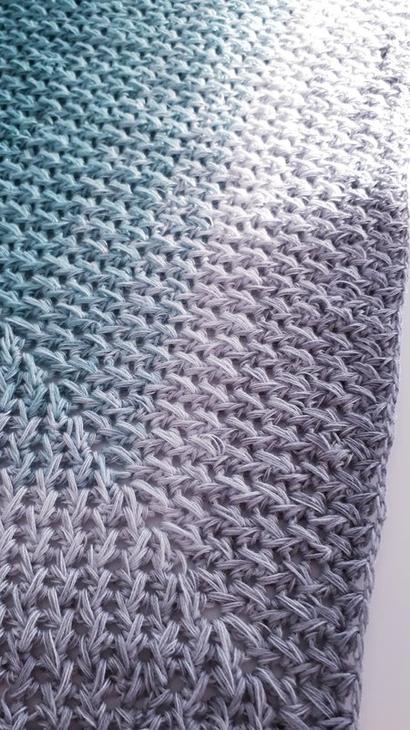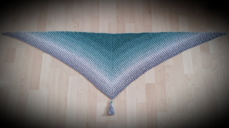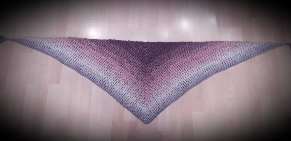 Für das Tuch habe ich 900m 3fädiges Farbverlaufsgarn mit Nadelstärke 4 verarbeitet,