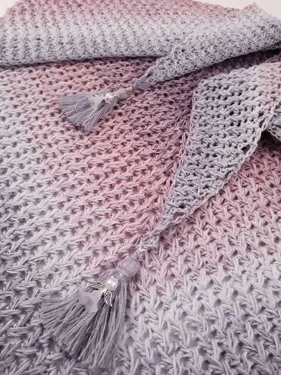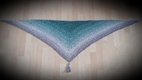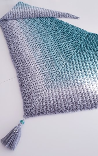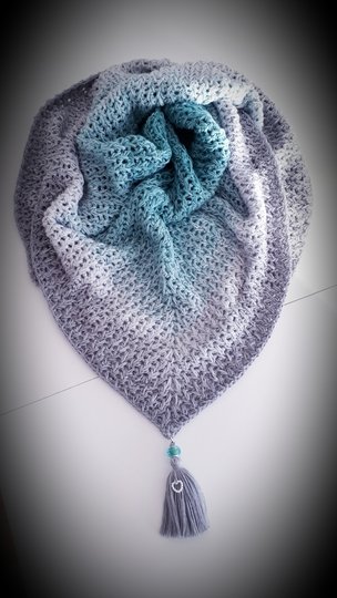Für das Tuch habe ich 900m 3fädiges Farbverlaufsgarn mit Nadelstärke 4 verarbeitet,