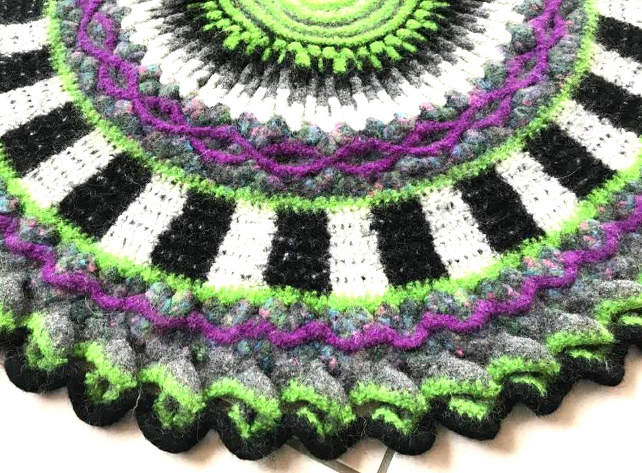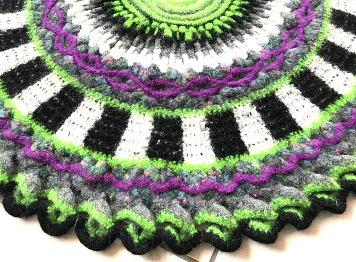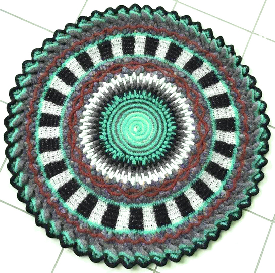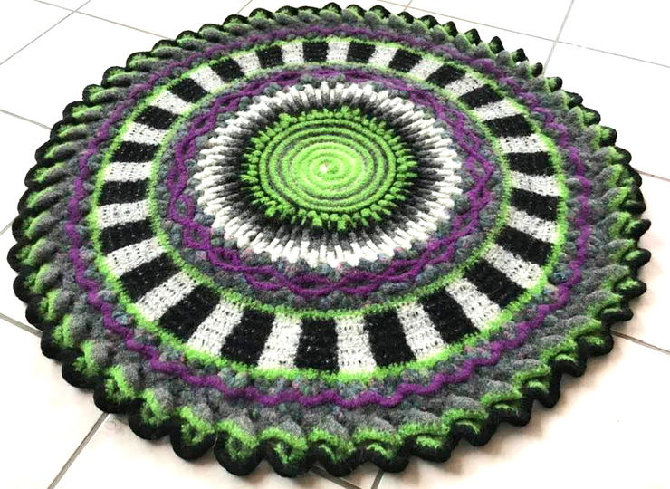 Mein fertiger Teppich wiegt 1300 gr und hat vor dem Waschen einen Durchmesser von 120 cm.... und nach dem Waschen in der Waschmaschine bei 40° und mit 6 Tennisbällen nur noch 90 cm Durchmesser.....er ist jetzt wunderbar verfilzt und wie ein richtiger Teppich!