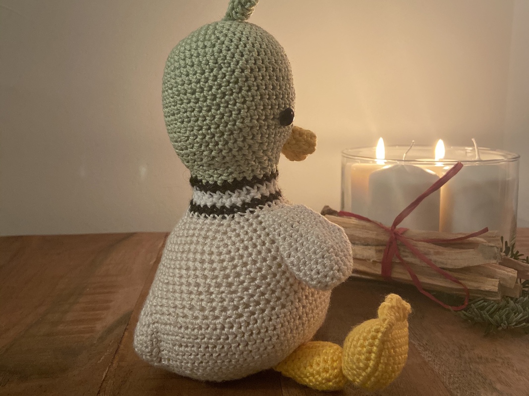 Stehend ist die Ente 24 cm groß und sitzend 20 cm.