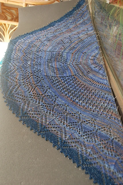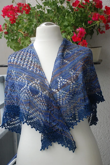Das Tuch ist mit selbstgefärbter Sockenwolle (grün) bzw. Opal-Wolle (blau) - Verbrauch ca. 120 g - LL ca. 420 m/100g - gestrickt.