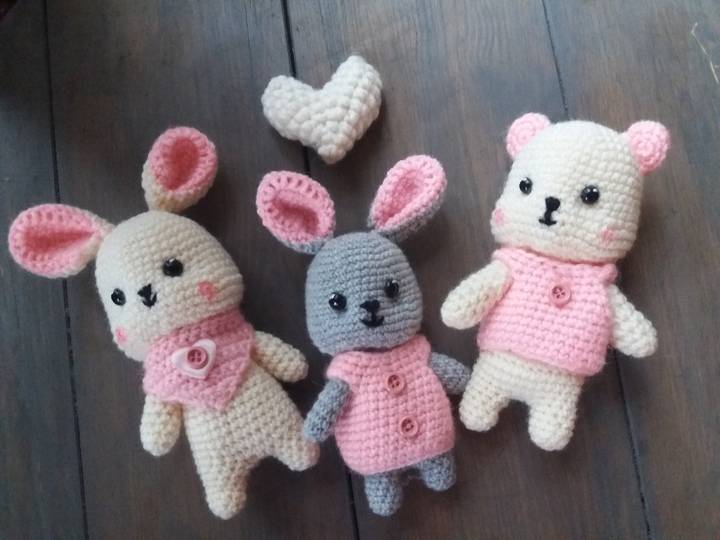 Der Hase und Bär werden mit der gleichen Anleitung gehäkelt nur die Ohren sind unterschiedlich.