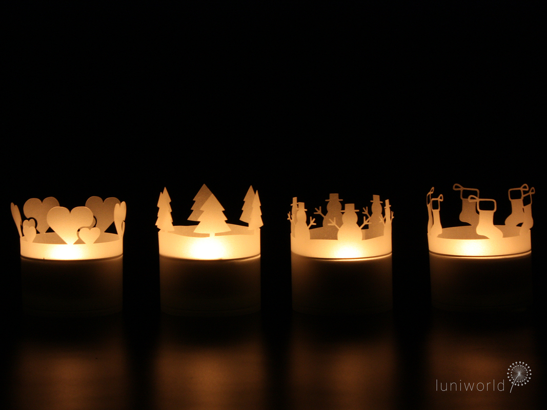 Enthalten sind neben der SVG-Datei eine DXF- und PDF-Datei mit jeweils 4 verschiedenen Motiven (Herzen, Schneemann, Tannenbaum und der Weihnachtssocke). Du benötigst einen Schneideplotter als auch Material zum Plotten, also zum Ausschneiden. Ich habe für die Teelichthüllen stärkeres Transparentpapier verwendet. Es eignet sich durch seine Stabilität super für die Hüllen. Aber auch Karton und Buntpapier eignen sich.