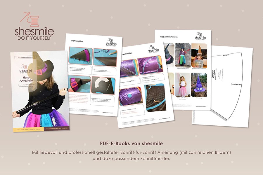 Du bekommst in diesem E-Book eine Schritt-für-Schritt Nähanleitung mit Schnittmuster für einen Hexenhut in Einheitsgröße.