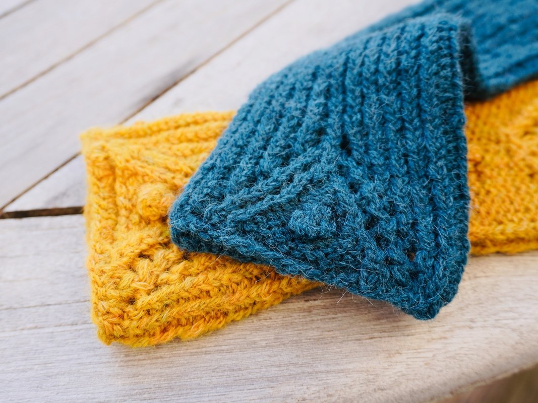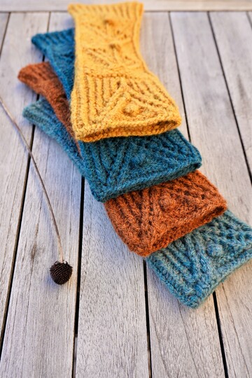 Die Armstulpen werden in Runden gestrickt – mit Daumenloch ein stückweit auch in Reihen. 2 unterschiedliche Lochmuster mit kleinen Noppen bilden das Schmuckelement während ein Rippenmuster für guten Halt sorgt. Es sind 2 Varianten beschrieben: Mit und ohne Daumenöffnung.