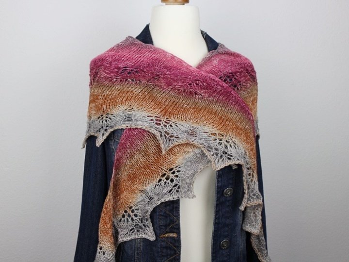 18 Maschen und 32 Reihen auf 10 cm in glatt rechts, nach dem Waschen, mit Nadelstärke Nr. 4,5 mm. Die Maschenprobe ist nicht so wichtig bei diesem Projekt. Eine andere Maschenprobe führt allerdings zu einem größeren oder kleineren Tuch bzw. zu einem anderen Garnverbrauch.