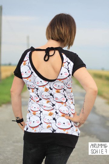 Benita ist ein figurnahes, sommerliches Raglanshirt mit rundem Rückenausschnitt. Das Shirt ist auf Jerseystoff ausgelegt und du kannst es sowohl mit kurzen Ärmeln als auch mit ¾ Ärmeln nähen.