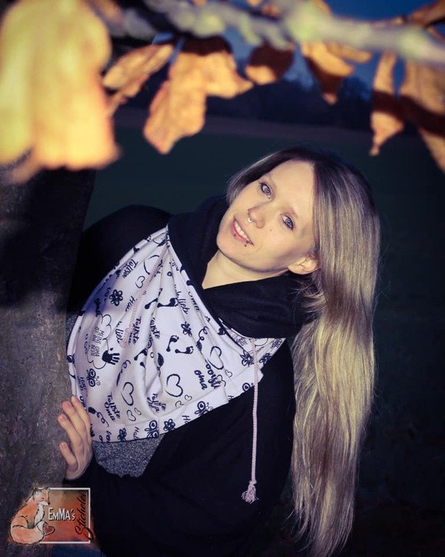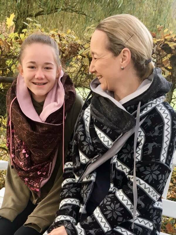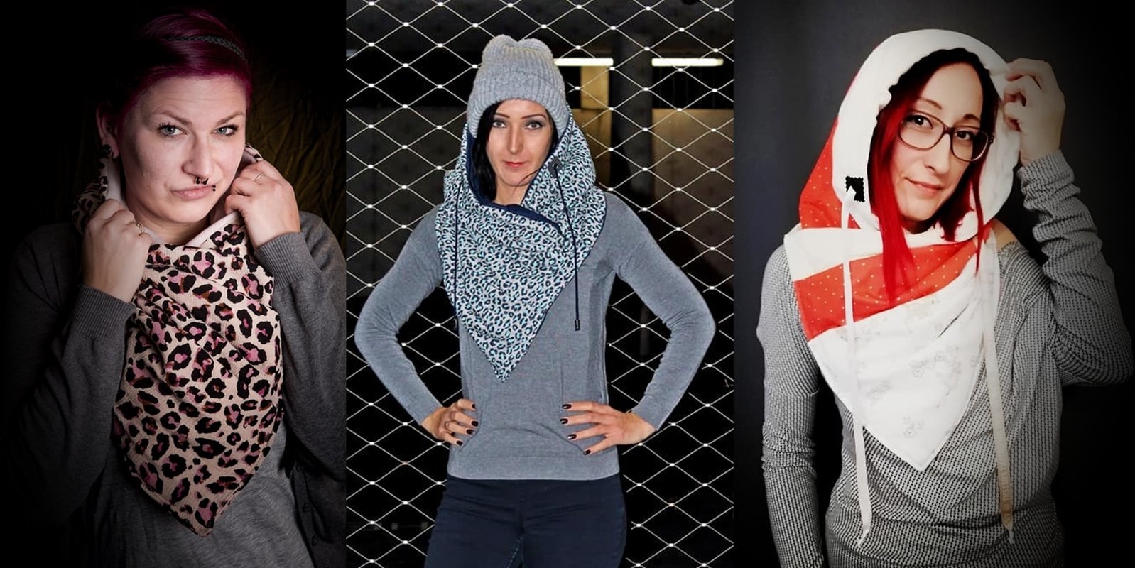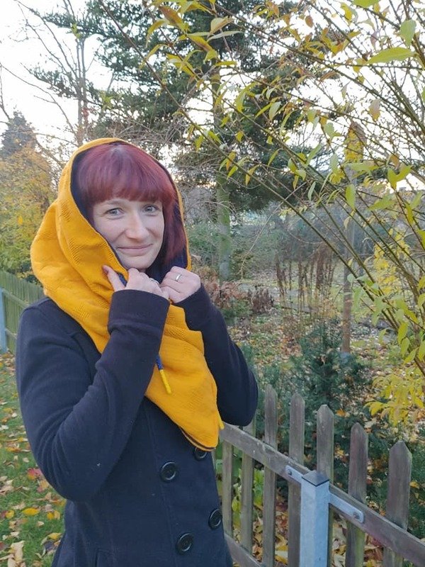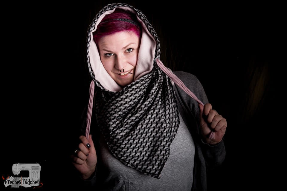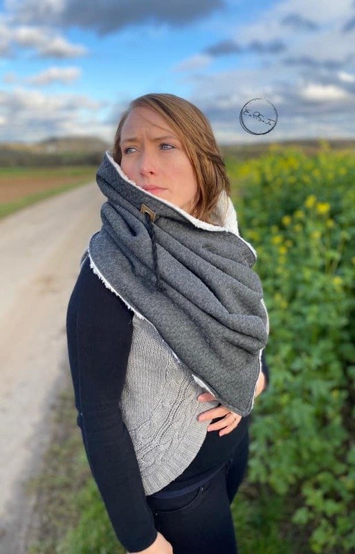Er hat ein kleines Gimmick...du sparst dir nämlich damit auch gleich die Mütze, denn du kannst dir den Schal auch wie eine Kapuze über den Kopf ziehen. Je höher das Teilchen genäht wird, desto mehr bedeckt er den Kopf.