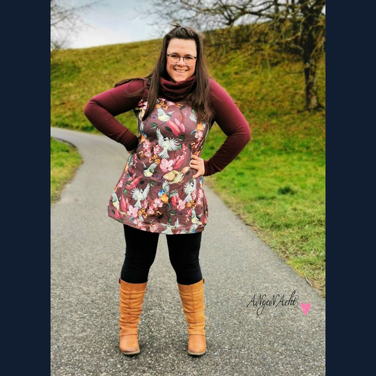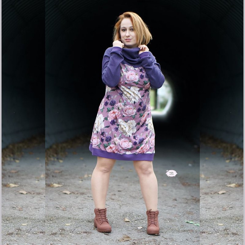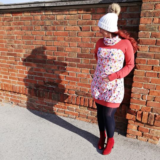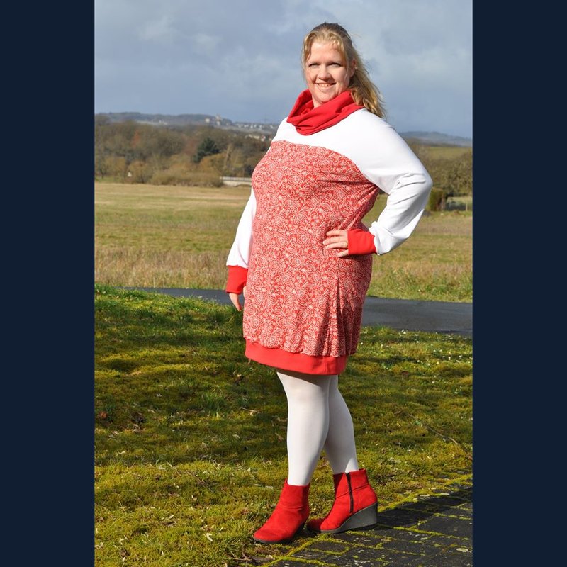 Lavea - Herzenswärme - ist ein kuschliger Maxi-Pulli oder Kleid (?) mit großem Kragen und Daumenloch-Bündchen. Ein echter Wohlfühl-Pulli für alle Damen.