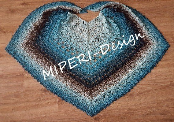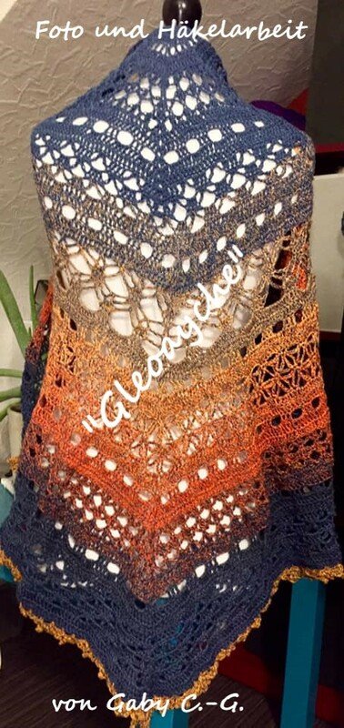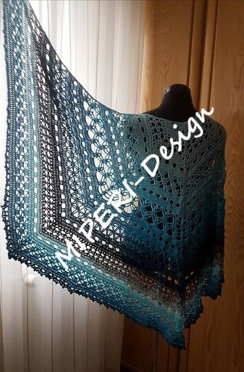 Hier kommt ein 5-Eck-Tuch, es besticht durch seine luftigen Mustermix-Abschnitte.