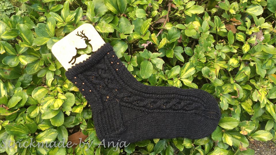 Diese Socken sind ein echter Hingucker: ein wunderschönes Zopflochmuster gepaart mit eingestrickten Perlen am Schaft.
