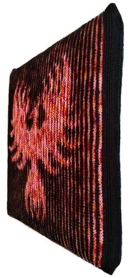 Ich empfehle für den Hintergrund Schwarz, für das Motiv leuchtende Rot-Orangefarbene Wolle.
