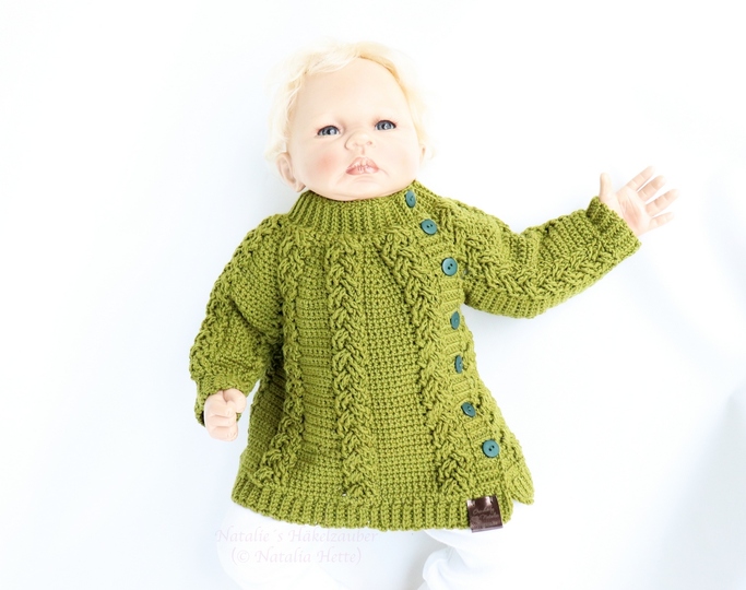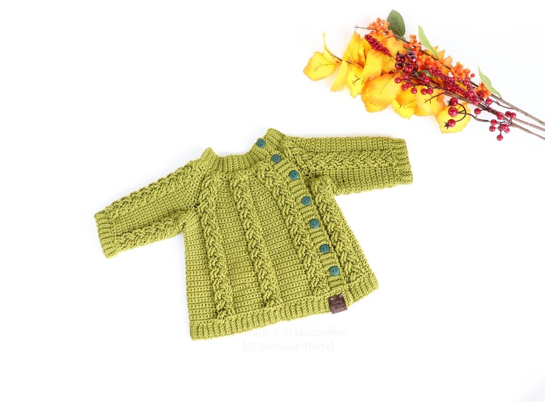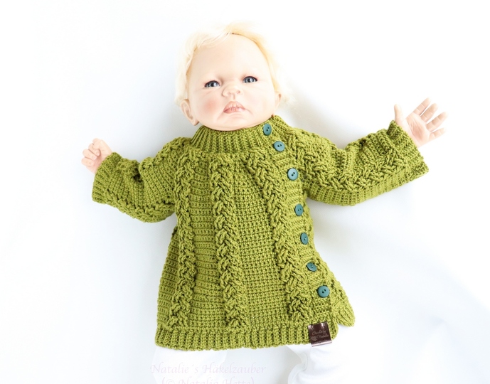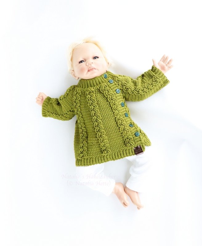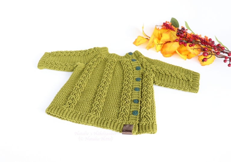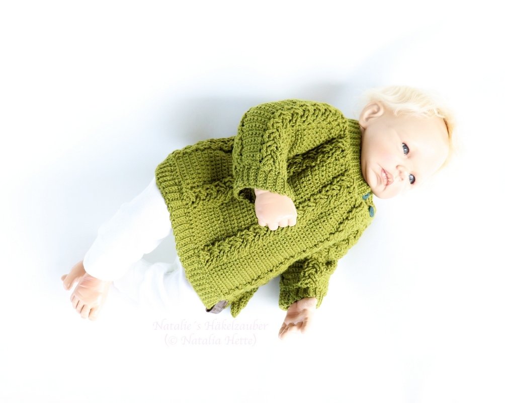 Diese PDF-Häkelanleitung besteht aus bebilderter Anleitung zum Häkeln von Baby- oder Kinderjacke "Ronja" für Gr. 56-128 (1 M. bis 7-jähriges Kind) mit Zopfmuster und seitlichem Verschluss. Diese Jacke wird als ein Teil gehäkelt (runde Schulterpasse) und hat keine Nähte. Ein tolles Kleidungsstück für bequemes Tragen!
