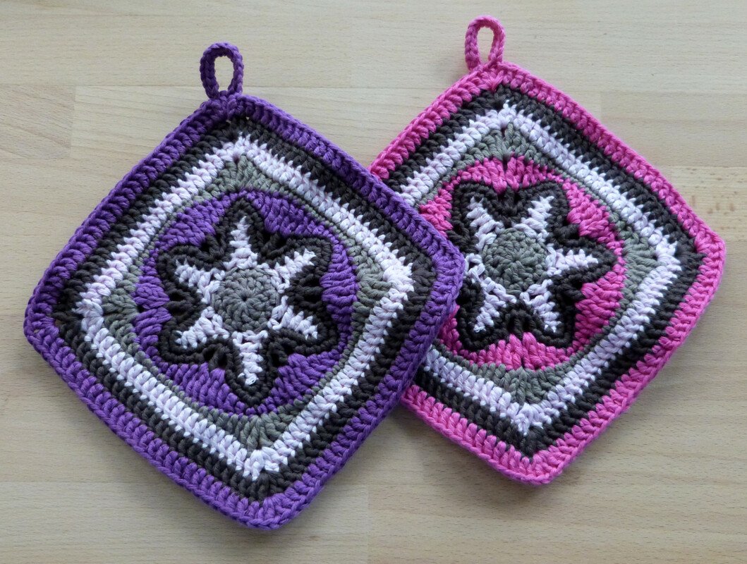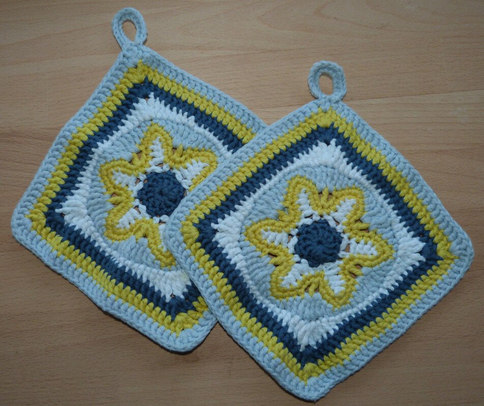 Häkel dir doch ein paar tolle Topflappen in deinen Lieblingsfarben und setze damit einen farblichen Akzent in deiner Küche! Die Topflappen sollen aber nicht nur dekorativ herumhängen sondern dürfen auch benutzt werden, und wenn du Baumwollgarn verarbeitest, kannst du sie bei Bedarf problemlos bei 60°C in der Maschine waschen.