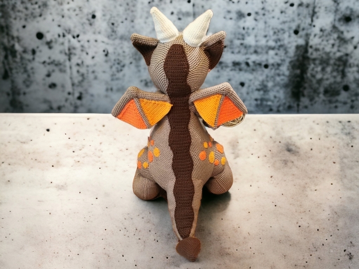 Der Fertige Drache wird ca. 46cm hoch. Natürlich kann die Größe variieren, je nachdem ob man fest oder locker häkelt. Auch die Wahl der Wolle ist entscheidend. Ich selbst häkle mit Apollo Baumwollgarn 125m/50g (100% Baumwolle).